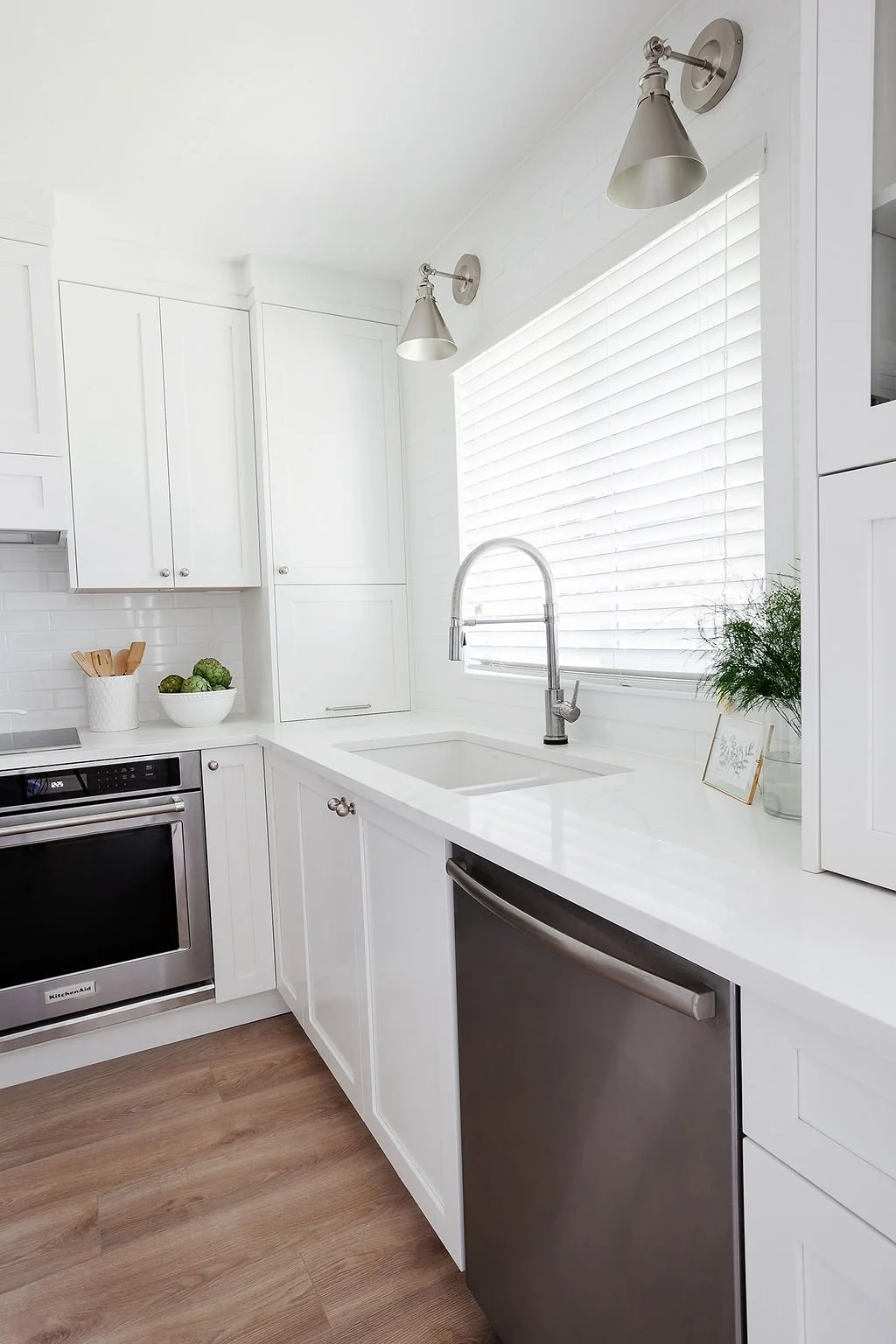 We transformed the original kitchen into a bright, inviting heart of the home with custom shaker cabinetry, luxe hardware, and crisp white subway tile. Special details like a pull-out pantry, coffee bar, hidden outlets, and a stunning 8-foot island make the space as functional as it is beautiful. Double ovens add convenience, while thoughtful storage solutions keep the counters clutter-free.